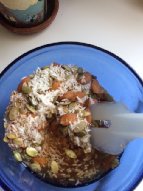 Then in a bowl mix a cup of whatever you choose from nuts, seeds, dried fruits, etc. I used raw almonds, and pumpkin seeds (because that's what I had!) that I buy from the bins in our local market.
